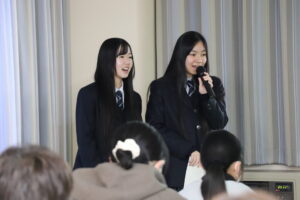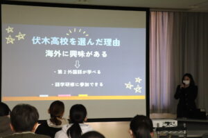 3年生2名が本校を選んだ理由や3年間の学校生活を振り返りながら、“伏木高校の魅力”を話しました。