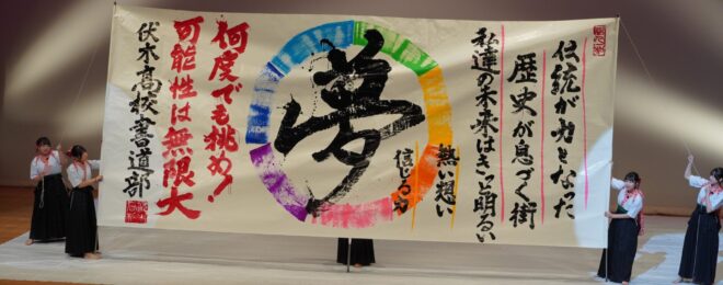 11/1(土)新高岡市誕生20周年記念式典で書道部員が書道パフォーマンスを披露しました。 「夢」・「挑戦」をテーマに、5人の部員でダンスや音楽を含めた構成を考え、見てくださる方々に勇気を与えることができるように練習を重ねた渾身の作品です …
